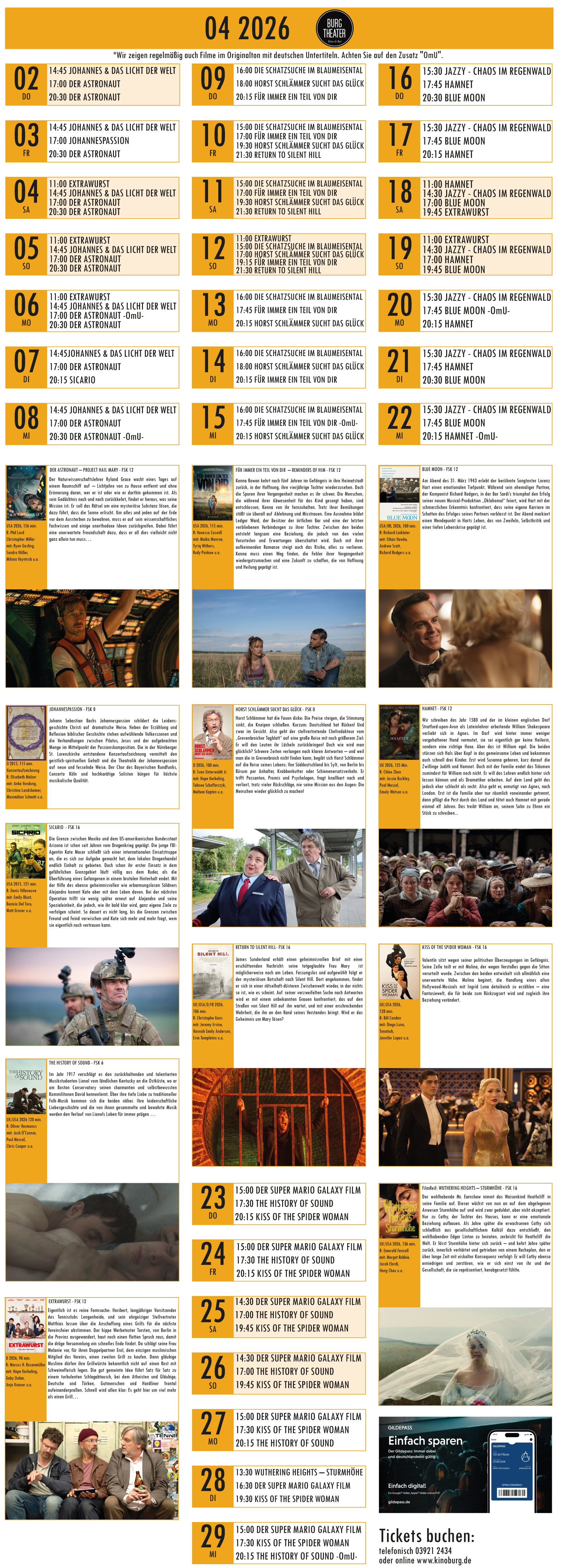 Unsere Kasse ist werktags spätestens ab 11 Uhr, am Wochenende spätestens ab 13 Uhr besetzt (im Zweifel an der Portiersglocke läuten). Sie können dort Tickets im Vorverkauf, zur aktuellen Vorstellung sowie Gutscheine zum Verschenken erwerben.